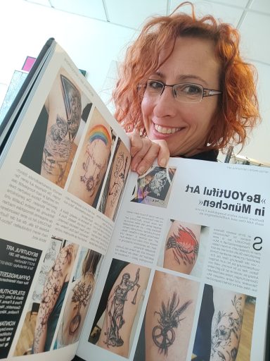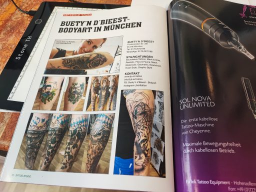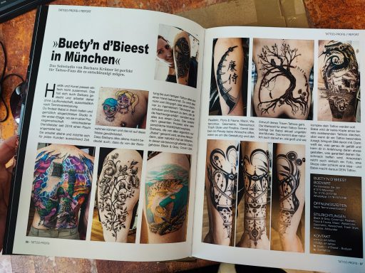 Man findet mich mit meinen Arbeiten im Tattoo Studio Bayern Magazin, eine Sonderausgabe von Tattoo Spirit. Außerdem bin ich auch im Tattoo Profis Buch Teil 1 und auch Teil 2 zu finden. Wenn ich mal wieder auf einer Messe anzutreffen bin, dann werde ich das rechtzeitig verkünden. Meine letzte Messe liegt schon ein paar Jahre zurück.